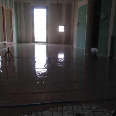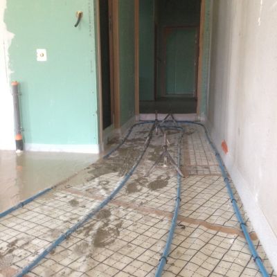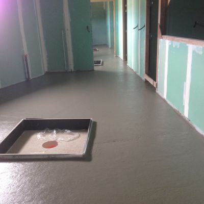 Cette isolation a notamment permis de mettre rapidement en oeuvre (le lendemain de la projection) le plancher chauffant de l'école et dès la pose du réseaux chauffant nous avons pu l'enrober et couler la chape fluide.