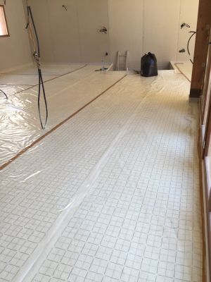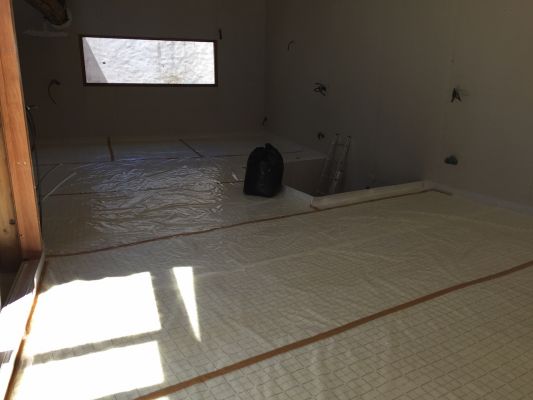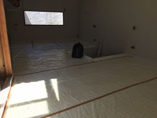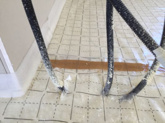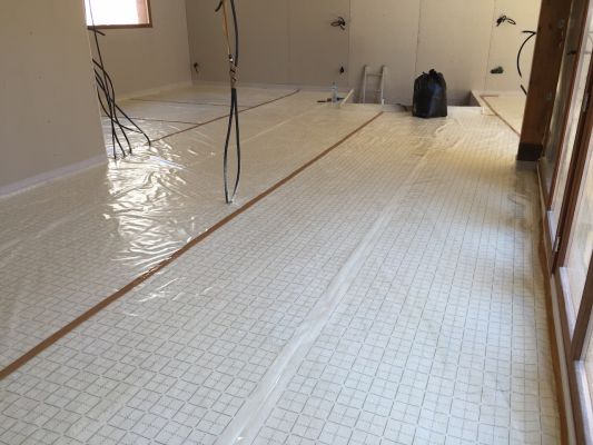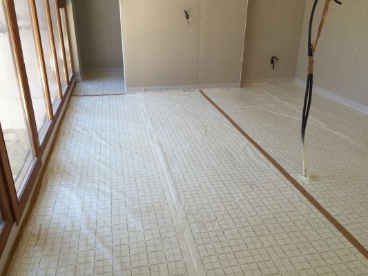 Sur un plancher béton nous avons projeté un tapis de mousse qui a fait office non seulement de ravoirage (pour enrobage des réseaux) mais aussi d'isolation des sols avec un coef. thermique exeptionnel et surtout sans pont thermique. Le tout sur une épaisseur bien moindre que les solutions classiques, de plus avec un gain de poids non négligeable dans ce genre de réhabilitation.